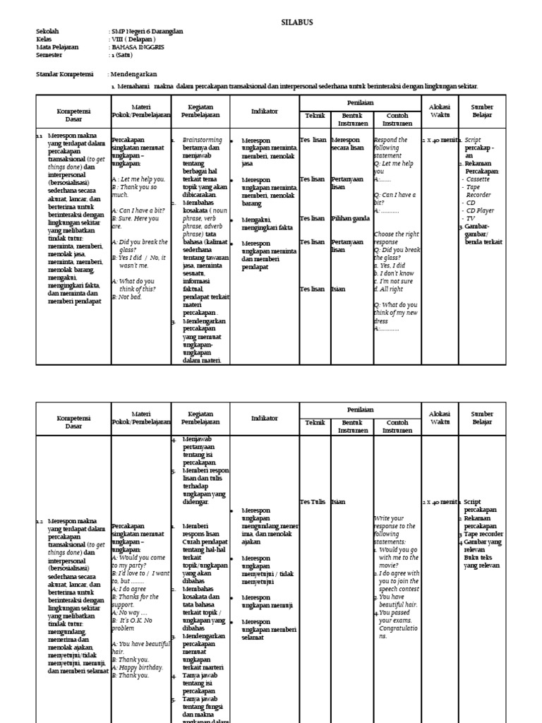 Silabus k13 bahasa inggris kelas x smk negeri 1 jagoi babang. Berikutnya kami bagikan kembali perangkat pembelajaran kurikulum 2013 smp/mts yaitu dengan perangkat untuk silabus dan rpp k13 smp lengkap semua mata pelajaran yang bisa anda gunakan sebagai bahan. Silabus sma/ma mata pelajaran : Bahasa inggris tidak dapat dipungkiri adalah bahasa utama komunikasi antarbangsa dan sangat diperlukan untuk berpartisipasi dalam pergaulan dunia. File tersebut juga dapat anda cetak dengan.